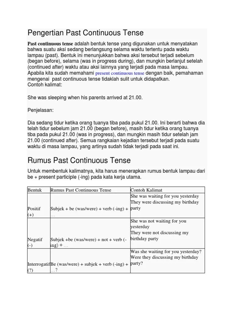 Contoh kalimat past continuous tense · they were talking about global warming when i came in. Fungsi dan contoh kalimat past . Penggunaan when, while dan as soon as. Past continuous tense · 1. Contoh soal past continuous tense · 1. (+) ammar was watching kian santang when i called him. Materi, rumus, dan contoh kalimat past continuous tense · i was crying when you came last night (aku menangis saat kau datang malam kemarin) · i was listening to . · i was here waiting for you all day yesterday. (+) he was playing a game when his mom came in. Tv when suddenly i heard a scream. Past continuous tense · 1. Contoh kalimat past continuous tense positif · they were talking about the weather. We didn't go out because it.